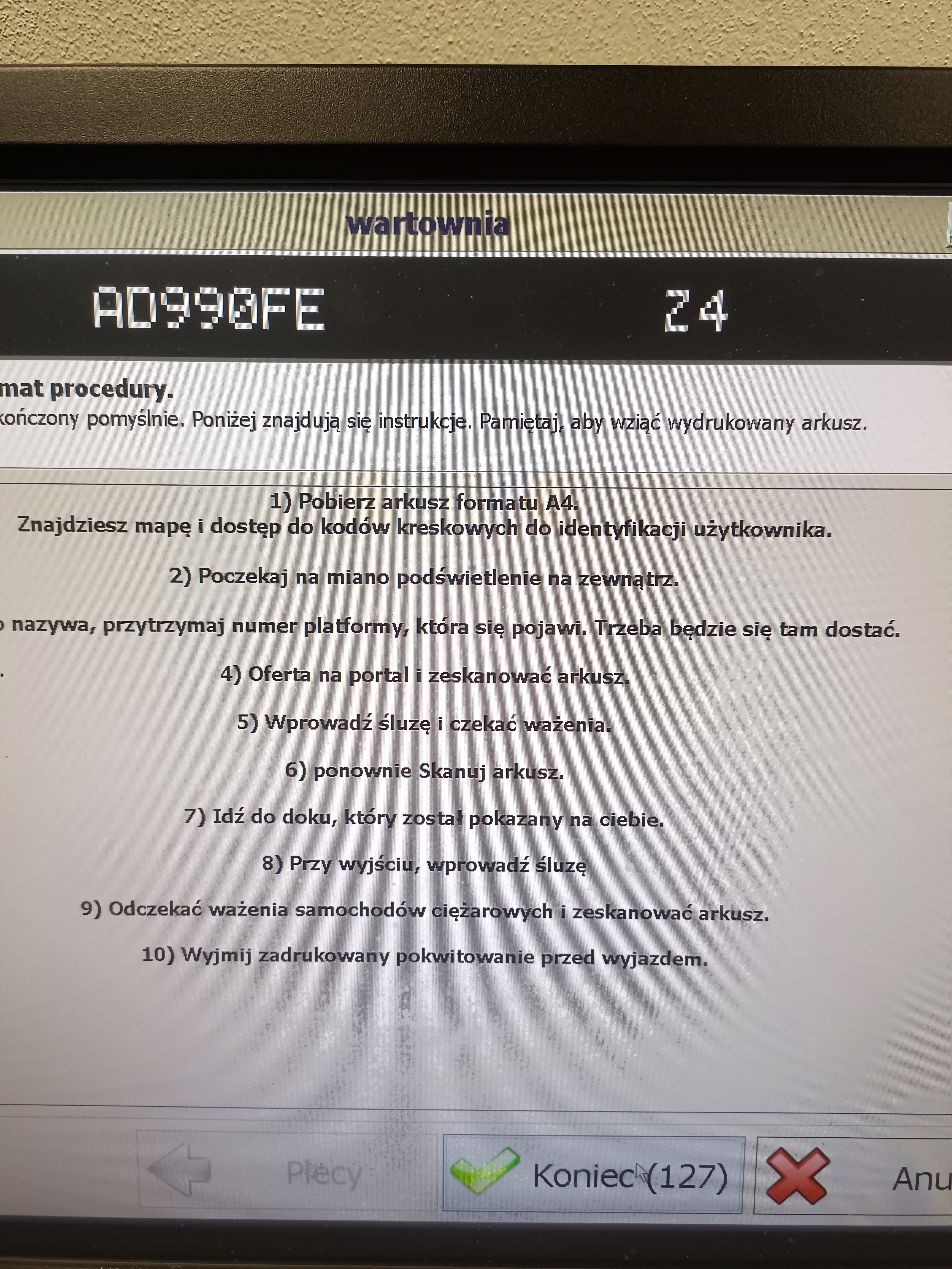 Pour le chargement, nous entrons dans le parking par le portail d'un petit bâtiment, saisissons nos données et notre numéro de référence sur l'ordinateur. qui commence par SO.... Ensuite, vous imprimez une carte et allez à la voiture, attendez que l'immatriculation de la remorque apparaisse sur le tableau en haut et avec une rampe, par exemple P12, tout est bien décrit sur la carte. Lorsqu'on s'approche du portail, on scanne le code du document, on entre dans la balance et là on scanne également le code pour ouvrir le deuxième portail et se rendre à la rampe indiquée, les palettes peuvent être sorties à la rampe, le chargement est rapide, les gens sont très gentils, vous devez noter votre numéro cmr. En partant, on scanne le code de la même manière